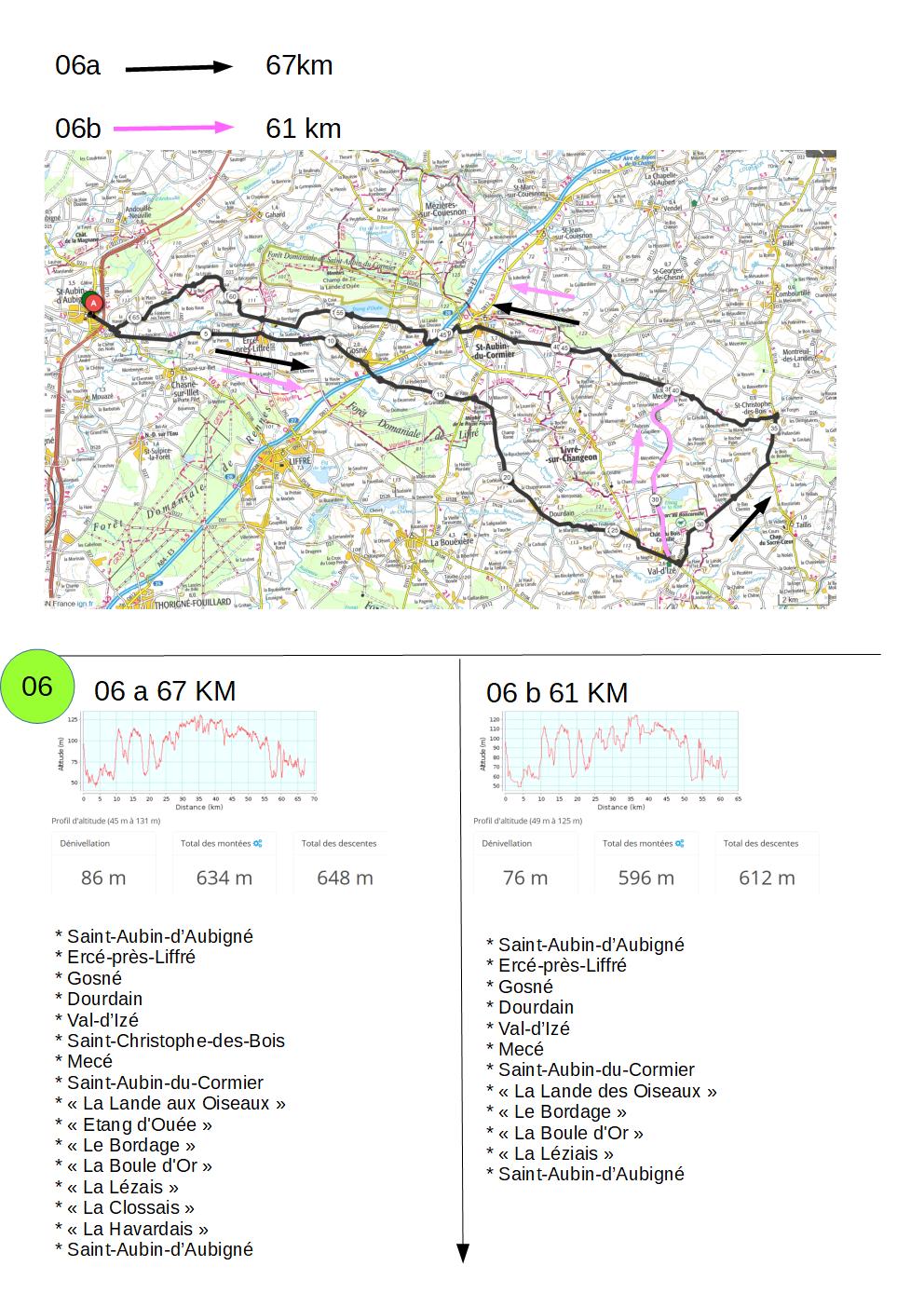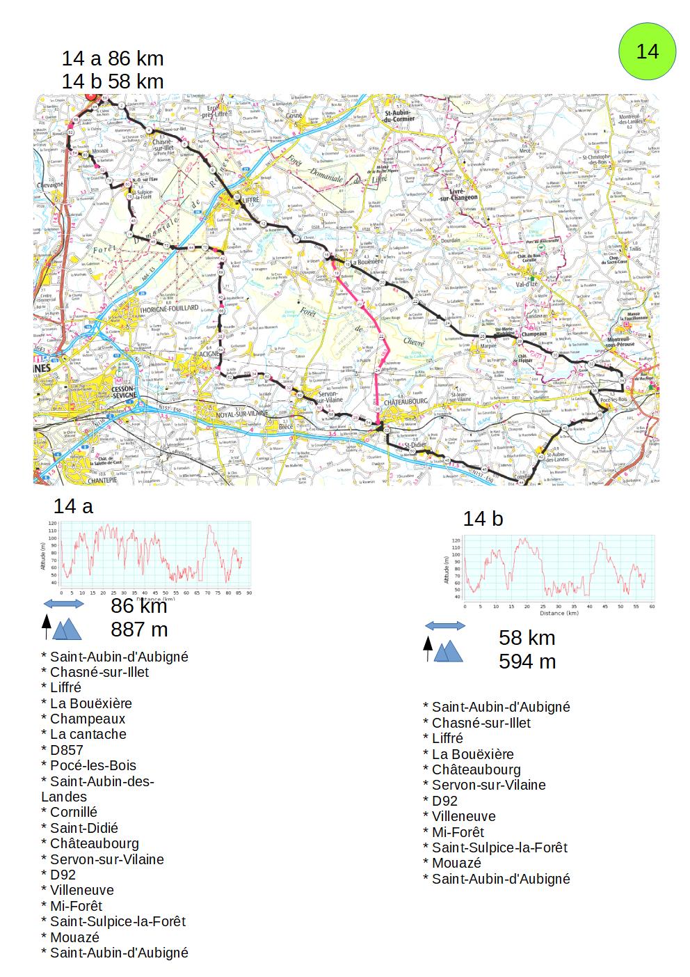 * Saint-Aubin-d’Aubigné * « La Croix de Brin » * Aubigné* Montreuil-sur-Ille * Dingé* Combourg * Lanhélin* Tressé * Le Tronchet * Bonnemain * Cuguen* Saint-Léger-des-Prés * « Forêt de Bourgouët » * Feins * Aubigné * « Marylande » * Saint-Aubin-d’Aubigné